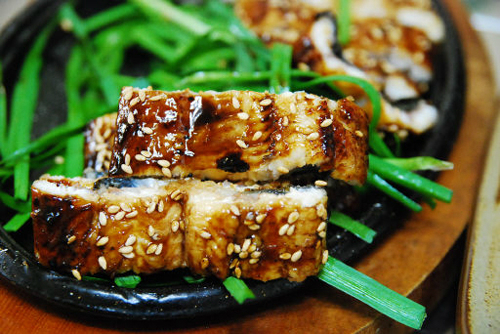 2. 장어구이=장어는 입맛을 잃고 더위에 지쳐 기력이 약해진 여름철에 좋은 보양식이다. 지방이 많아 칼로리가 높기 때문이다. 장어는 비타민A가 풍부해 피부를 윤기나게 하고 병에 대한 저항력을 길러주며 야맹증에도 효험이 있다. 애벌구이 한 뒤 단간장이나 매운 고추장양념, 소금 등으로 맛을 더한다.