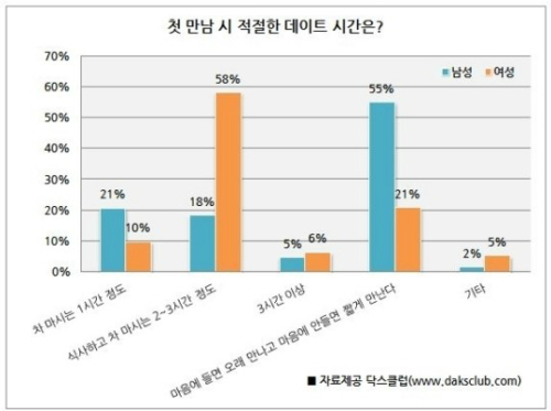 먼저 남성 응답자의 55%가 “마음에 들면 오래 만나고 마음에 들지 않으면 짧게 만난다”고 답해 눈길을 끌고 있다. 반면 여성은 “식사하고 차 마시는 2~3시간 정도(58%)”라고 구체적으로 답해 호감도에 상관없이 시간의 선을 그은 것으로 나타났다.