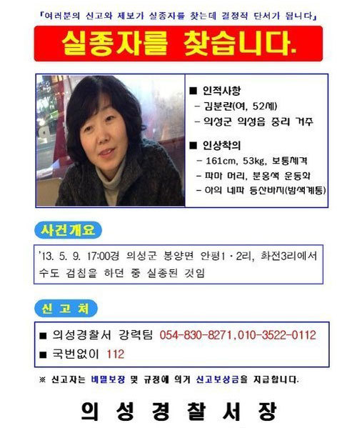 경북 의성경찰서는 지난 9일 의성군 봉양면에서 김분란(52·여)씨가 실종된 것과 관련해 공개수사로 전환한다고 13일 밝혔다.