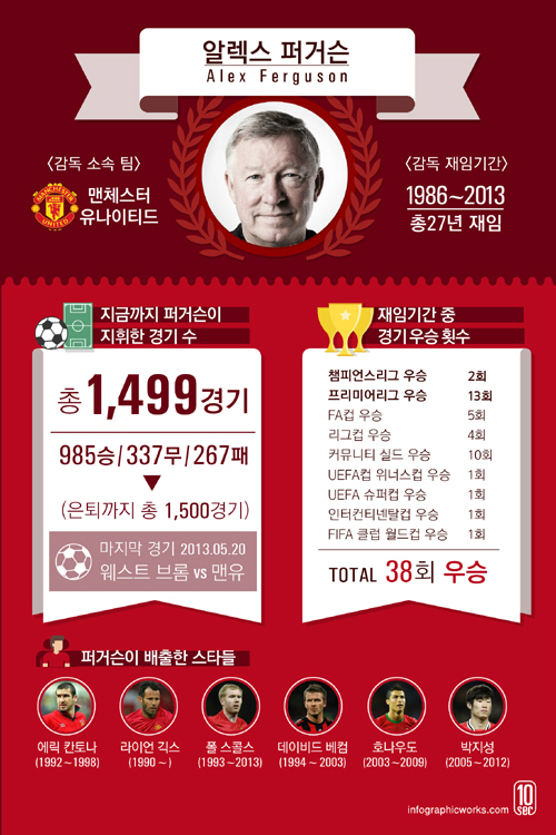1986년 11월 22일 맨유의 지휘봉을 잡은 퍼거슨 감독은 ‘살아있는 전설’로 불린다. 27년간 팀을 이끌면서 프리미어리그, UEFA 챔피언스리그, FA컵 등의 주요대회에서 총 38회의 우승을 차지했다. 지난해에는 IFFHS(국제축구역사통계재단)에서 선정한 21세기 최고의 감독상을 수상하기도 했다.