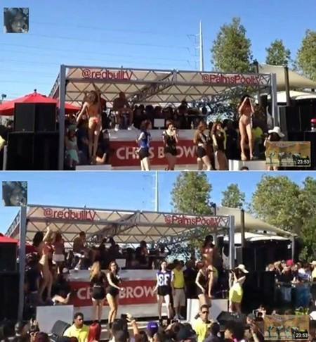 27일(현지시간) 동영상 사이트 유튜브에는 티아라엔포가 전날 라스베이거스의 한 수영장에서 가수 크리스 브라운의 무대에 오른 영상이 게재됐다. 해당 영상에서 티아라엔포는 협소한 무대 위에서 좌우에 비키니 걸 3명이 선정적인 춤을 추고 있는 가운데 노출이 심한 의상을 입고 ‘전원일기’를 부르고 있다.