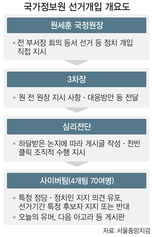 ◆70여명이 모여 인터넷 활동심리전단은 원 전 원장 재임기간 인터넷에 총 1970건의 불법 정치 관련 게시글을 올렸다. 2010년 6월 지방선거를 앞두고서는 한명숙 당시 민주당 서울시장 후보의 뇌물수수 사건 등을 집중적으로 언급하는 게시글을 올렸다. 특히 심리전단은 총선과 대선 등 정치적으로 민감한 시기에 더욱 왕성한 활동을 벌였다.