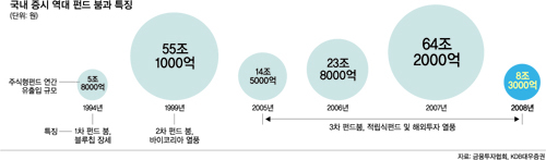 4차 펀드 붐의 파고는 얼마나 높고 길까. 역대 펀드 붐의 주식형 펀드 자금 유입 규모는 1차 6조1000억원, 2차 66조8000억원, 3차 109조2000억원에 달했다. 펀드 붐의 위력은 갈수록 길고 강해진 셈이다.