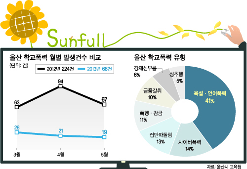 상위 20위권 안에 든 울산지역 학교에서는 올 들어 언어폭력이 단 한 건도 발생하지 않았다. 지난해 2월 울산시교육청이 지역 학교를 대상으로 학교폭력 전수조사를 실시한 결과, 학교폭력 유형 중 욕설·언어폭력(41%)이 가장 많았다. 다음은 카카오톡이나 미니홈피 등 댓글을 통한 사이버폭력(14%)인 것으로 나타났다.