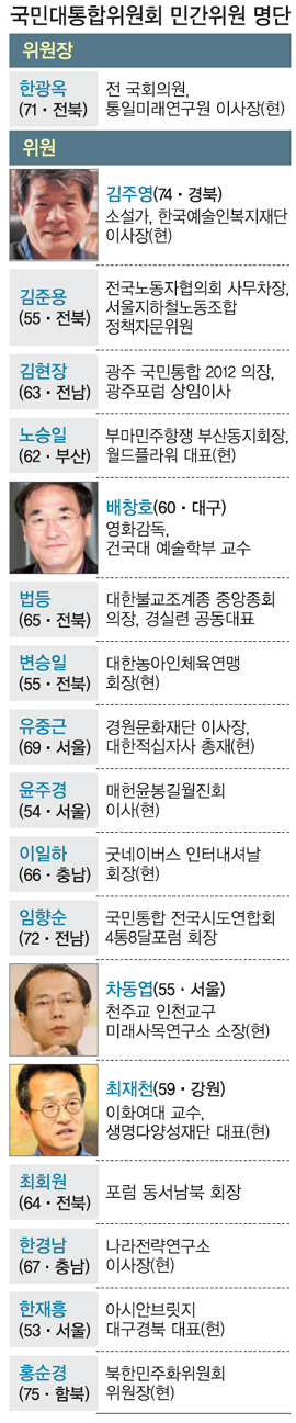 청와대가 17일 발표한 국민대통합위원회 민간위원에는 노동운동이나 민주화운동을 했던 인사가 대거 이름을 올렸다.