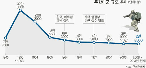 진보진영서 ‘미군철수’ 주장도 나와 6·25전쟁 정전협정이 체결된 직후인 1953년 8월8일 서울에서 한·미 상호방위조약이 가조인됐다. 이를 근거로 미군은 전쟁이 끝난 뒤에도 한국에 남게 됐고 이후 60년간 주한미군은 한·미 동맹의 상징이 됐다. 한국은 성장 과정에서 북한의 도발을 억제해준 주한미군에 큰 빚을 졌다. 다른 한편으론 일부 주한미군의 일탈행위로 국민 정서가 악화되기도 했다. 미국의 대외 정책 기조 변화에 따라 변천을 거듭해온 주한미군은 2015년으로 예정된 한·미 전시작전권 전환을 통해 위상이 바뀐다. 한반도 통일 과정에서도 주한미군은 핵심 변수로 부상할 전망이다.