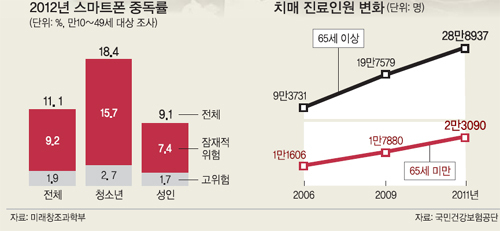 아직 스마트 기기 사용과 치매의 상관관계가 밝혀진 것은 아니지만, 젊은 치매 환자가 계속 늘고 있는 것만은 분명하다. 국민건강보험에 따르면 2011년 65세 이하의 치매 진료인원은 2만3090명으로 2006년에 비해 198.9% 증가했고, 특히 40세 미만의 젊은 치매 환자가 171.1% 늘어났다. 전문가들은 기억력 감퇴를 막고 뇌 활동을 활발히 하기 위해 손으로 일기·가계부를 쓰거나 계산을 암산으로 하고 전화번호를 외워서 누르는 습관을 들여야 한다고 조언한다.
