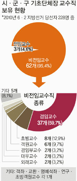실제 세계일보가 네이버 인물검색을 통해 2010년 6월 지방선거 당시 전국 시·군·구 기초단체장 당선자 228명의 주요 경력을 확인한 결과 47명(20.6%)이 모두 65개의 교수 직함을 갖고 있었다. 당선자 5명 중 1명꼴이다. 이들의 교수 직함은 ‘겸임’(37개), ‘초빙’(8개), ‘객원’(6개) 등 무려 62개(95.4%)가 비전임교수였고, ‘전임교수’는 3개에 그쳤다.