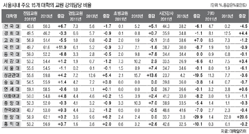 세계일보가 15일 대학정보 공시사이트인 대학알리미에 올라온 서울시내 주요 15개 대학의 2011년과 올해 ‘교원 강의 담당비율’을 비교한 결과 13개 대학에서 시간강사의 강의비율이 줄었다. 13개 대학의 시간강사 강의 시수(1주일 강의시간)는 2년 새 평균 8.2%포인트 하락한 반면 겸임·초빙교수는 평균 3.82%포인트 증가했다. 그럴 만한 이유가 있다. 정부가 재정지원 시 대학 평가 항목의 하나인 ‘교원확보율’에 비전임교원인 겸임·초빙교수도 9학점을 채우면 교원 1명으로 인정되도록 하면서다.