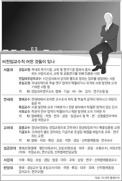 “대학이 각종 비전임교수와 강의·연구·산학협력교수 등 ‘비정규직 전임교수’를 뽑는 이유는 간단하다. 적은 인건비로 편하게 쓰면서 교원확보율도 채우는 다목적 카드다.” 지방의 한 국립대 산학협력중점교수의 말이다. 대학마다 비전임교수가 많지만 명칭과 근로조건 등은 제각각이다. 대학에 오래 몸담은 전임교수들조차 자기 대학의 비전임교수 규모나 하는 일(강의)을 잘 모른다. 교육당국도 비전임교원 관리는 대학 자율에 맡기고 있다. 그 결과 ‘특정 분야에서 뛰어난 업적을 이루거나 현장경험이 풍부한 전문가의 지식과 경험을 학생들에게 전달하겠다’는 비전임교수제의 취지가 ‘나이롱 교수’를 양산하는 자리로 퇴색하고 있다.