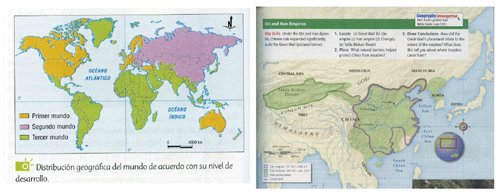 세계 각국의 교과서에는 한국에 대한 잘못된 정보를 전달하는 경우가 적지 않게 보인다. 콜롬비아 교과서(왼쪽)는 개발 수준에 따른 세계지리분포도에서 한국을 아프리카, 남미 등과 같은 제3 세계로 표시하고 있고, 미국의 교과서에서는 중국 한나라의 영역이 한반도 중부에까지 걸쳐 있다.