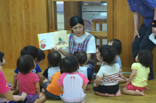 | 아유미보육원에서 한 교사가 그림책을 들어 보이면서 아이들에게 이야기를 하고 있다. 보육원은 사카보육센터 등의 도움을 받아 다양한 그림책과 부교재 등을 활용해 연령별 보육 프로그램을 채택해 보육한다. |