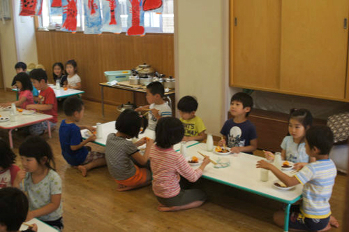 | 오사카시 주오구 나카테라 1번가에 위치한 아유미보육원에서 아이들이 연령별로 그룹을 지어 일본과 오사카의 지역 농산물로 만든 다양한 형태의 간식을 먹고 있다. |