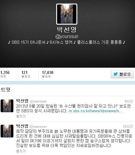박선영 아나운서는 21일 자신의 트위터에 “제작 담당자 부주의로 故 노무현 대통령과 유가족분들께 큰 상처를 드리게 된 것에 대해 심심한 사과 말씀 올립니다. SBS ‘8시 뉴스’ 진행자로서 일이 여기에 이르기까지 살피지 못한 점 송구스럽게 생각합니다. 진실한 보도를 위해 더욱 책임 있는 자세로 임하겠습니다”라는 글을 올렸다.