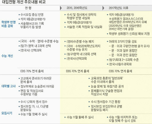 한 번의 원서작성으로 여러 대학에 지원할 수 있는 공통원서접수시스템은 2015학년도 정시모집(국립대 41개교)을 시작으로, 2016학년도에는 모든 대학에 적용된다. 내년 고1 학생부터 적용되는 A∼E등급의 성취평가제(절대평가)는 2017학년도 대입부터 반영될 예정이었지만 2019학년도까지 2년 유예하고 2020학년도 이후 적용 여부는 2016년 결정키로 했다.