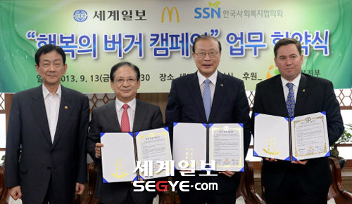 | 13일 서울 종로구 신문로 세계일보에서 열린 ‘행복의 버거’ 캠페인 업무협약식 후 진영 보건복지부 장관, 김병수 세계일보 사장, 차흥봉 한국사회복지협의회 회장, 조 엘린저 한국맥도날드 사장(왼쪽부터)이 기념촬영을 하고 있다. 이제원 기자 |