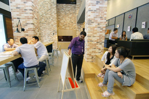 | LG전자가 서울 여의도 LG트윈타워 서관 33층에 마련한 소통공간인 ‘오아시스 캠프’에서 직원들이 자유롭게 아이디어 회의를 열고 있다. LG그룹 제공 |