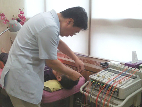 | 안구건조증 환자가 눈 주변의 경혈을 자극하는 침과 뜸을 이용해 한방치료를 받고 있다. |