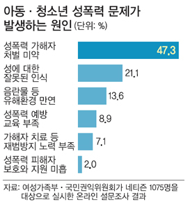 아동·청소년 성폭력의 주요 원인을 묻는 질문에 응답자의 47.3%는 ‘가해자 처벌이 미약하기 때문’이라고 답했고 ‘성(性)에 대한 잘못된 인식’이 21.1%, ‘음란물 등 유해 환경 만연’이 13.6%로 뒤를 이었다.