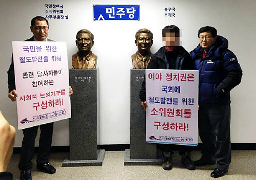 | 27일 민주당에 들어간 철도노조 최은철 사무처장과 노조원이 피켓을 들고 민주당 공공부문 민영화 저지 특별위원장인 설훈 의원과 사진을 찍고 있다. 연합뉴스 |