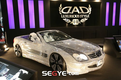 10일 일본 도쿄 인근 치바현 마쿠하리메세에서 열린 ‘2014 도쿄오토살롱’에서 자동차 액서사리 업체에 전시차로 등장한 벤츠 2대가 크리스탈 보석으로 꾸며졌다.D.A.D 부스에 전시된 메르세데스 벤츠 SL600은 차체에 30만 개의 스왈로브스키 크리스탈을 붙여 보석처럼 반짝인다.