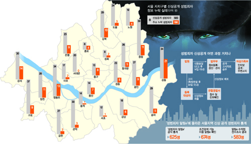 ‘성범죄자 알림e’는 살펴볼수록 가관이다. 서울지역 전체 성범죄자가 공식 통계 625명, 검색기능 674명, 실제 정보공개 583명으로 제각각인 것은 그런대로 봐줄 만하다. 심각한 문제는 공개된 성범죄자들의 정보가 부실하거나 잘못 기록돼 있다는 점이다. 성범죄자들의 전자발찌 부착과 전과경력이 실제보다 대폭 축소 입력돼 있다는 의혹도 제기된다. ‘성범죄자 알림e’만 보고 “우리 동네는 안심해도 된다”는 말을 하기 어렵다는 의미다.