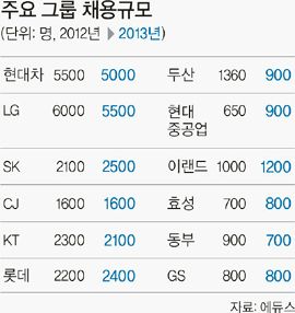 지난해 채용규모를 줄인 곳은 현대차, LG, 두산, KT, 동부 등이다. 두산은 2012년 1360명에서 2013년 900명으로 33.8% 줄었다. 동부는 22.2%(900명→700명), 현대차그룹 9.1%(5500명→5000명), KT 8.7%(2300명→2100명), LG 8.3%(6000명→5500명) 감소했다.