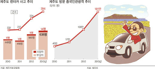 실제 지난해 4월 서귀포시 남원읍 5·16도로를 운행하던 렌터카 차량이 전복돼 가족 여행에 나선 일가족 6명 중 4명이 숨지는 대형 사고가 발생했다. 올 들어서도 1월 서귀포시 안덕면 덕수교차로에서 30대 렌터카 운전자가 신호등을 들이받아 숨졌고, 같은 날 서귀포시 보목마을에서 40대 운전자가 몰던 렌터카가 다리 밑으로 추락해 일가족 4명이 중·경상을 입는 등 렌터카 사고가 끊이지 않고 있다.