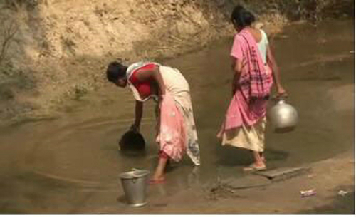 | 웅덩이에 고인 더러운 물을 식수로 쓰기 위해 떠가는 인도 아삼주 주민들. KBS 제공 |