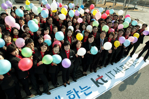 지난 14일 강원 원주 KT리더십아카데미에서 열린 IT서포터즈 8기 출범행사에 참석한 직원들이 앞으로의 다짐을 적은 풍선을 흔들어보이고 있다.