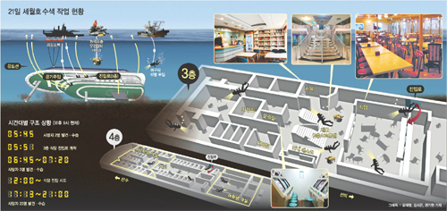 하지만 이날 오후 수색과정에서 13구는 4층 선미 부분 3개 객실에서, 10구는 3층 라운지에서 발견됐다. 식당보다는 단원고 학생들의 객실이 몰려 있던 4층에서 더 많은 시신이 발견된 것이다. 침몰 당시 3층 객실에 있던 승객들이 뒤늦게 빠져나와 로비 곳곳에 남아 있을 가능성도 크다. 세월호에서 편의점 관리와 식사시간에 배식하는 일을 맡았던 송지철(19)군도 “(16일 오전) 8시50분쯤 식당에 서 있는데 발목까지 바닷물이 차오르기 시작했다”며 “오전 7시쯤부터 식사를 마친 학생들은 이미 객실과 로비로 흩어진 상태였고, 당시 식당에는 청해진해운 사무장과 주방 아주머니, 뒤늦게 식사를 시작한 여교사 2∼3명뿐이었다”고 기억했다.