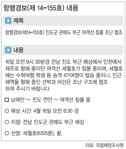 세월호가 구조신호를 보낸 시각보다 앞서 해양경찰이 선박의 이상징후를 감지한 것으로 나타났다. 사고 당일인 16일 오전 8시10분에 해양경찰이 단원고에 전화를 걸어 백모 연구부장과 통화를 하며 ‘배와 연락 안 됨’이라는 내용을 전했다. 이는 이미 세월호에 문제가 발생했다는 사실을 해경이 먼저 알았다는 것을 의미한다.