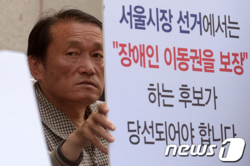 앞서 서울장애인차별철폐연대는 지난 15일 서울 여의도 정 후보 캠프 앞에서 서울시 장애인권리보장정책 요구안 공약화를 촉구하는 회견을 열었다.