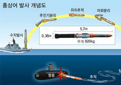 | 적 잠수함을 공격할 수 있는 국산 대잠어뢰 홍상어가 왕건함(DDH-Ⅱ)의 국산 수직발사체계를 통해 발사되고 있다. ADD 제공 |