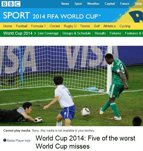 BBC는 8일(현지시간) 브라질월드컵 특집 코너를 통해 '월드컵 역사상 최악의 실수 5가지'를 공개했다. 1위는 2010 남아공월드컵 조별리그 최종전인 한국-나이지리아전에서 나온 아예그베니 야쿠부(나이지리아)의 실수가 선정됐다.