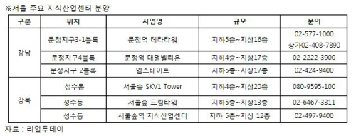 강남의 접근성이 뛰어난데 비해 강남보다 저렴한 가격으로 송파구 문정지구와 성동구 성수동은 기업들의 관심이 커지면서 지식산업센터 공급도 잇따르고 있다.