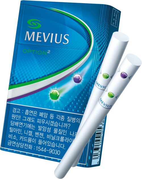 메비우스 옵션(MEVIUS OPTION²)은 ‘쿨링 팝(Cooling Pop)’ 싱글 캡슐 15개비로 시원한 맛을, ‘쿨링 팝(Cooling Pop)’과 ‘퍼플 팝(Purple Pop)’으로 이루어진 5개비의 더블 캡슐을 통해 상큼한 맛을 제공한다. 기호에 따라 최대 4가지 맛을 경험할 수 있다.