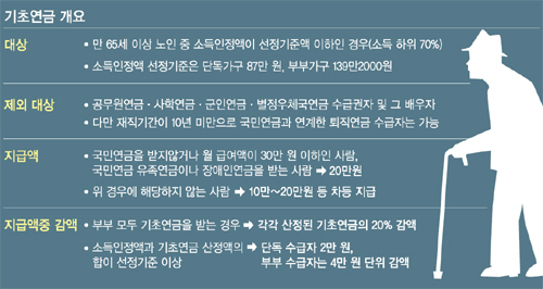 박근혜 대통령의 선거공약으로 추진된 기초연금이 1년여 진통 끝에 7월부터 시행된다. 대상은 만 65세 이상 노인의 약 70%인 447만명이며, 액수는 1인당 매월 최대 20만원까지 지급된다. 소득 수준이나 기존 국민연금 수령액 등에 따라 지급 대상과 지급액이 달라진다. ‘월소득인정액’ 같은 어려운 용어 때문에 자신이 대상이 되는지, 된다면 얼마나 받을 수 있는지 궁금해하는 사람들이 많다. 가상의 사례를 통해 기초연금에 대해 쉽게 알아본다.