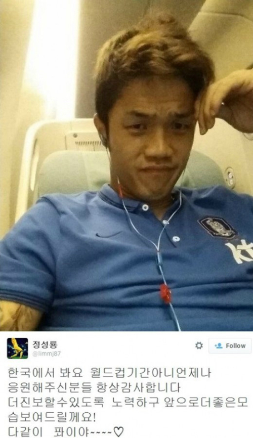 정성룡은 지난 29일 자신의 트위터에 "한국에서 보자. 월드컵 기간 아니, 언제나 응원해주신 분들 항상 감사하다. 더 진보할 수 있도록 노력하고 앞으로 더 좋은 모습 보여드리겠다. 다 같이 퐈이야"라는 글과 한장의 사진을 올렸다.