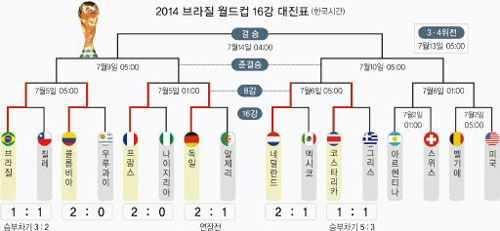 전통의 강호로 꼽히는 각조 1위 팀들이 모조리 8강 티켓을 거머쥐었다. 우승 후보로 꼽히는 A조 1위 브라질은 B조 2위 칠레를 잡았고 C조 1위 콜롬비아도 D조 2위 우루과이를 따돌렸다. 브라질과 콜롬비아는 오는 5일 8강전에서 격돌한다.