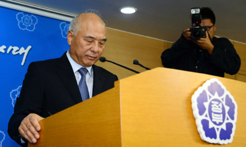 문창극 전 국무총리 후보자가 사퇴 기자회견에서 눈을 감은 채 고개를 숙이고 있다. 이 한 편의 블랙코미디를 설명하는 말 중 하나로 ‘일인지하 만인지상’이란 시대착오적 수식어가 어김없이 쓰였다. 세계일보 자료사진 |
