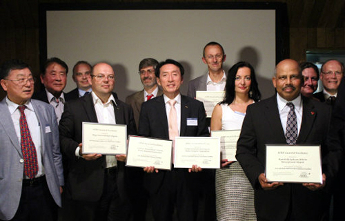 | 18일(현지시간) 프랑스 보르도에서 세계항공교통학회(ATRS)의 ‘공항운영효율성상’을 받은 김석기 한국공항공사 사장(가운데) 등 수상자들이 기념촬영을 하고 있다. 한국공항공사 제공 |