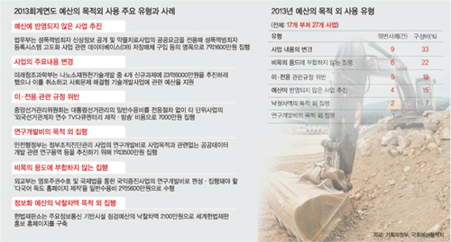 용도에 맞지 않는 사업에 예산을 집행한 일도 적지 않았다. 외교부는 영토주권 수호 및 국제법을 통한 국익 증진 사업의 일반수용비로 다국어 독도 홈페이지 제작을 수행했다. 이 사업은 독도에 대한 우리 정부의 입장을 외국인도 쉽게 찾아볼 수 있도록 한국어로 구성된 독도 홈페이지에 일본어, 영어, 중국어 등 7개국어 홈페이지를 추가하는 사업이다. 전산용역에 해당하므로 연구개발비로 편성·집행돼야 한다. 안전행정부는 국민대통합위원회 운영의 일반수용비로 갈등극복·국민통합 우수사례 원고료 1030만원, 정책연구협의회 과업수행 사례비 3000만원, 지역갈등에 대한 국민의식 여론조사비 1358만원, 소셜빅데이터 기반 대국민 소통 및 갈등 분석비 1990만원을 지급했다.