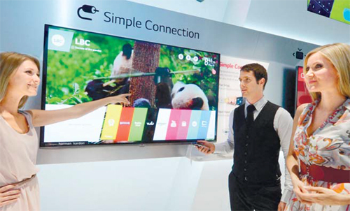 | 4일(현지시간) 독일 베를린 ‘IFA 2014’ 전시장에서 LG전자 모델들이 쉬운 사용성을 구현하는 웹OS 스마트+ TV를 선보이고 있다. LG전자 제공 |