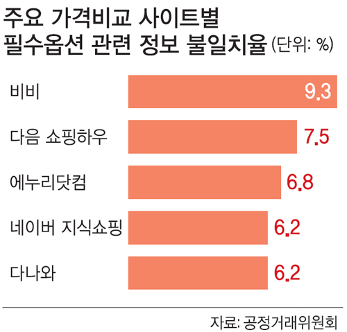 배송비·옵션정보 표시안해 온라인 쇼핑은 공간의 제약이 없어 같은 상품이라면 가격이 쌀수록 소비자의 선택을 받을 가능성이 크다. 가격비교 사이트가 인기를 누리는 이유다. 하지만 주요 가격비교 사이트에 등록된 스마트TV 등 일부 제품은 필수옵션과 추가 배송비 정보가 제대로 표시되지 않아 소비자를 혼동시키고 있는 것으로 드러났다. ‘저가’로 소비자의 눈을 현혹하고 있는 것이다.