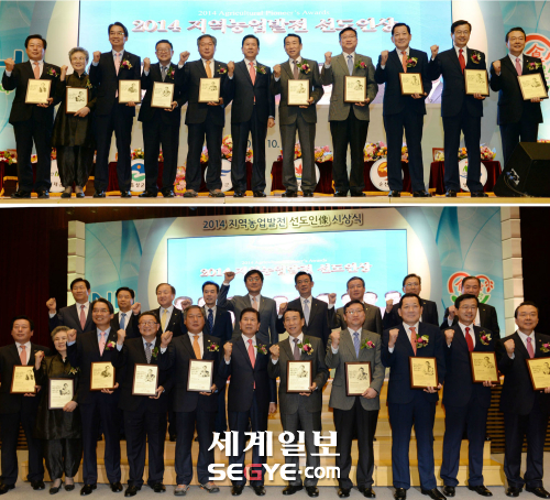 8일 오후 서울 중구 농협중앙회 본관 대강당에서 열린 ‘2014 지역농업발전선도인상 시상식’에서 최원병 농협중앙회 회장(왼쪽에서 여섯 번째)과 수상한 시,군 지자체장들이 기념촬영을 하고 있다. 지역농업발전 선도인상은 농협중앙회가 전국 지자체를 대상으로 지역농업과 농촌발전, 농업인의 삶의 질 향상에 기여한 지자체 10곳을 선정, 해당 지자체장에게 수여하는 상이다. 김범준 기자 bjkim@segye.com Copyright ⓒ 세계일보. 무단 전재 및 재배포 금지