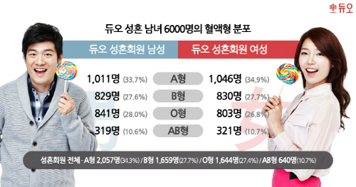 결혼정보회사 듀오는 지난 3년간 결혼한 6,000명(3,000쌍) 회원의 혈액형을 표본 조사, 분석한 ‘성혼 부부의 혈액형 정보’를 공개했다.