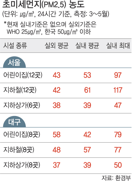 연구를 수행한 대구가톨릭대 양원호 교수(산업보건학)팀은 서울의 어린이집 12곳, 지하상가 6곳, 지하철역 12곳과 대구의 같은 시설 각 8곳을 측정했다.