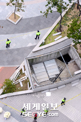 19일 경기도 성남시 분당구 판교 테크노밸리 유스페이스몰 야외공연장 환풍구 추락사고 현장을 경찰들이 지키고 있다. 성남=남정탁 기자 |