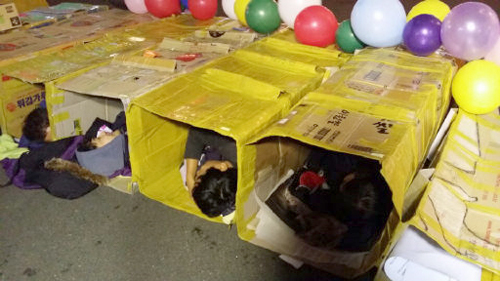 이지수 기자(맨 오른쪽)가 지난 10일 서울역 앞 광장에서 열린 ‘일반인 노숙 체험’ 행사에 참여, 박스 안에 누워 있다.